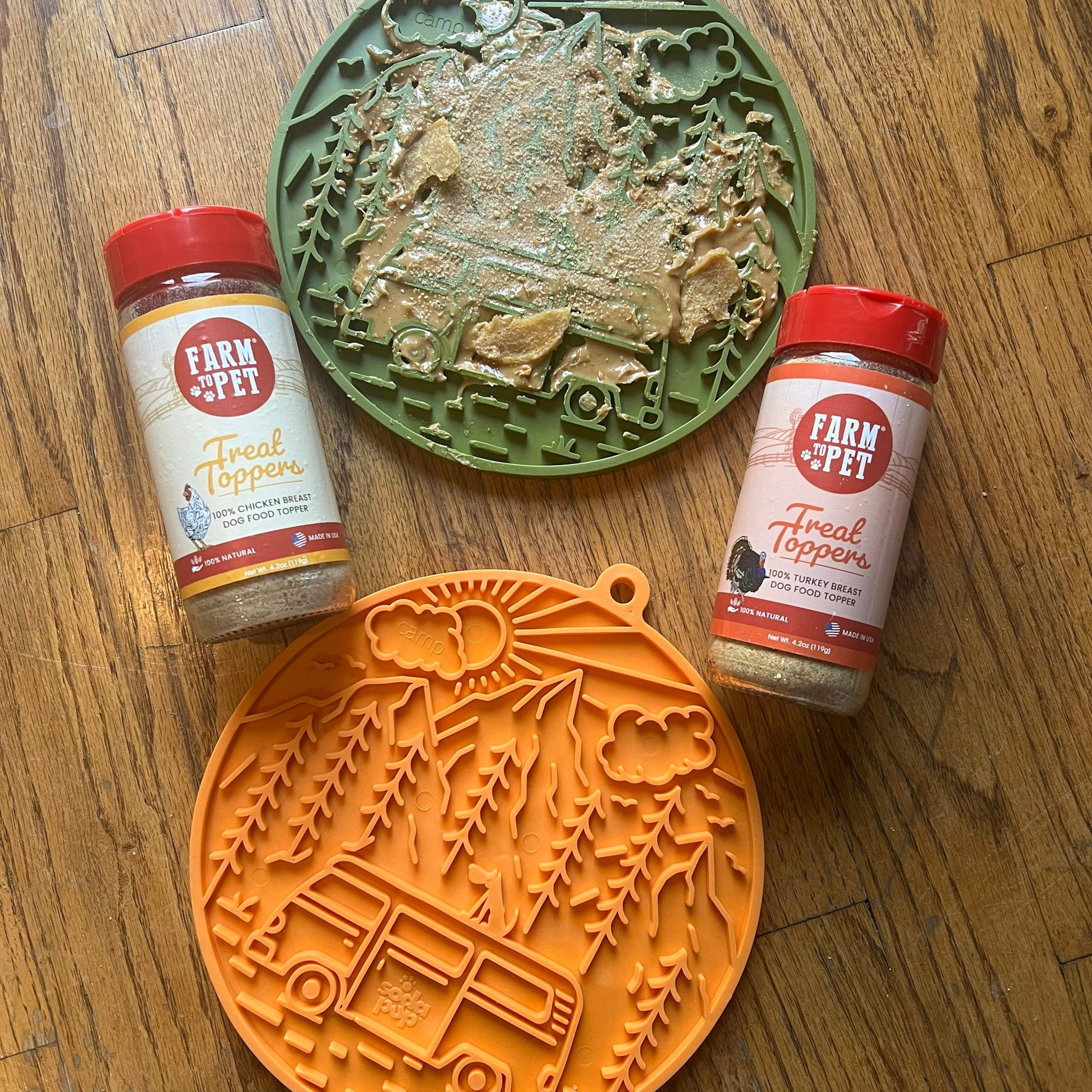 Here are just a few treats your dog can enjoy on a lick mat using Farm to Pet’s US-made single-ingredient protein-rich pet food toppers: