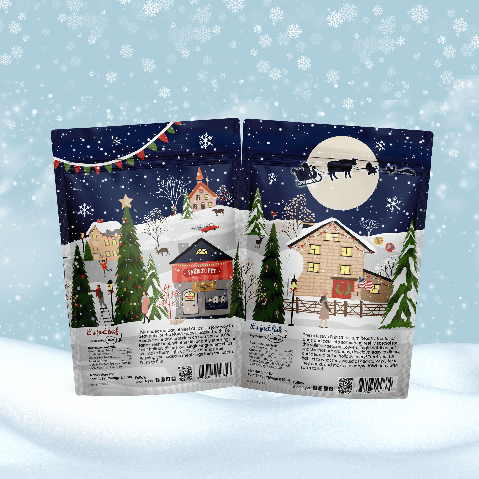 Treat your pets to the ulti-mutt snack experience this howliday season and make it a Farm to Pet "surf and turf" duo! When you bundle our Holiday Chips in beef and fish, not only does your fur baby enjoy five-star dining, but you enjoy five-star savings! Plus, these holiday dog treats are as convenient as they are healthy and festive, making them perfect gifts for pet owners and ideal for travel, training and party-going!